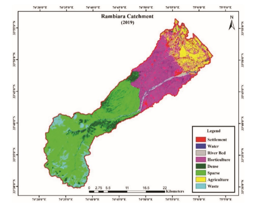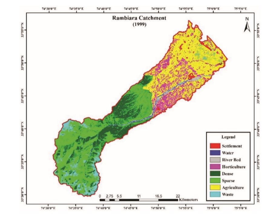 Horticulture industry is backbone of the economy of the Jammu and Kashmir, it has increased spontaneously from a recent couple of decades and had immensely impacted the socio-economic conditions of the inhabitants of the Rambiara Catchment. The study aimed to identify the varied land use and land cover categories prevailing over the Rambiara catchment and attempted to study the temporal changes. Multispectral images of the Landsat 7 and Landsat 8 were brought into use by making the LULC classes through the maximum supervised classification for the images of year 1999 and year 2019. Whole the study area was classified into eight major land cover categories i.e., Horticulture, Settlement, Water, Riverbed, Dense Forests, Sparce Forests and Waste Lands. The results obtained depicted that there was a large-scale positive change observed by the land cover categories of Horticulture +172.67 percent, Settlement +112.06 percent and sparse forest by +28.44 percent. The horticulture remained the highest achiever over the last 20 years and this is because of the high cash value realized from fruits, less agricultural production obtained from crops other than fruits and also due to changing climatic.